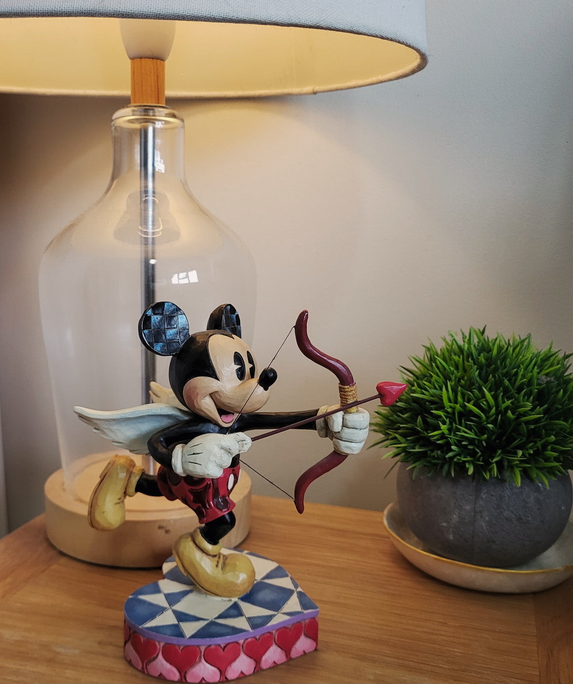 Add a touch of Disney romance to your collection with the Mickey Mouse Cupid “Love Is In The Air” figurine from the Disney Traditions collection by Jim Shore. This beautifully hand-painted piece features Mickey Mouse in a playful Cupid pose, aiming his bow while standing on a heart-shaped base, complete with angel wings.